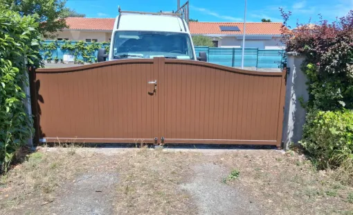 Moderne Menuiserie 33 à poser un portail aluminium marron à deux battants en Gironde.