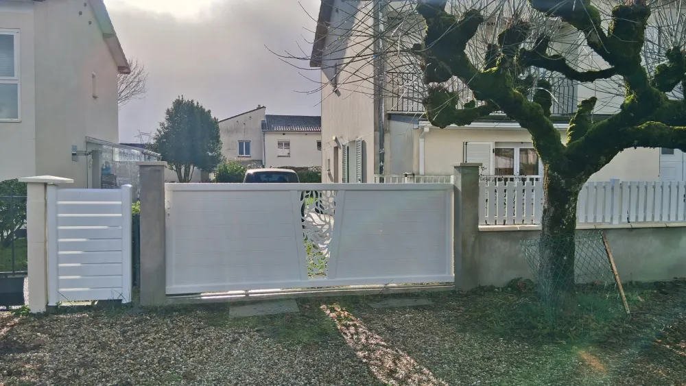Le remplissage en tôle décor feuillage apporte une véritable valeur ajoutée esthétique. Ce motif ajouré, à la fois moderne et élégant, permet de préserver l’intimité sans alourdir visuellement l’ensemble. Il transforme le portail en un véritable élément architectural, bien loin du simple équipement fonctionnel.